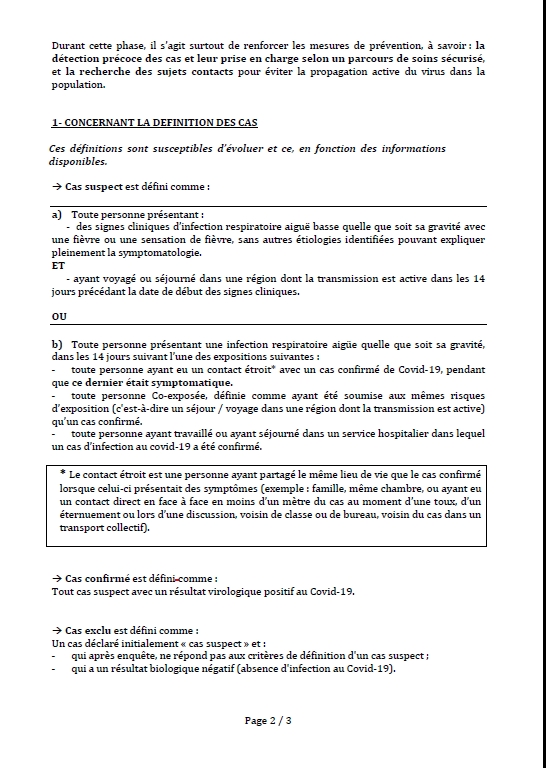 Gestion du cas suspect ou confirmé COVID-19 et des sujects contacts